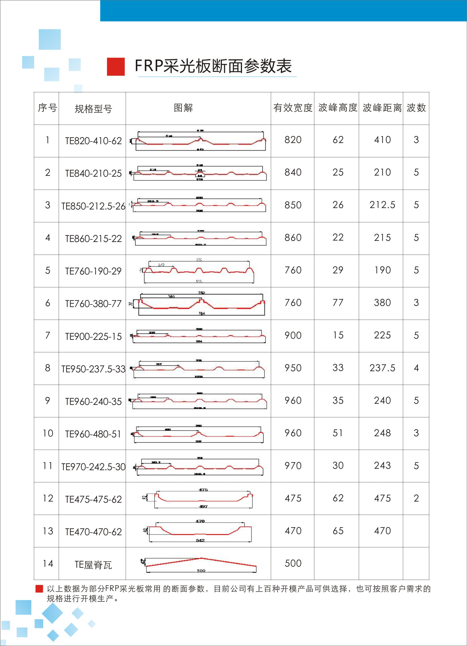 斷面形式 | (1)通用瓦型:760角馳瓦(俗稱暗扣)通用采光瓦、820角馳瓦(俗稱暗扣)通用采光瓦、840型、900型、980型、475型、1050型 TE屋脊瓦500型 (2)80MM-120MM寬FRP采光平板 (3)開模生產定制型號 | ||